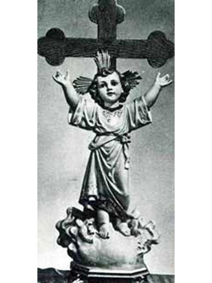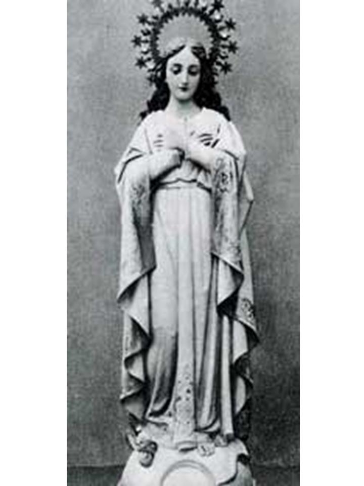 "It (the modern Miraculous Medal) was not the design originally intended, which was the first phase of the Great Apparition, 'The Virgin of the Globe' offering the golden ball to Heaven while the rays streamed from her hands upon the large globe on which she stood."
