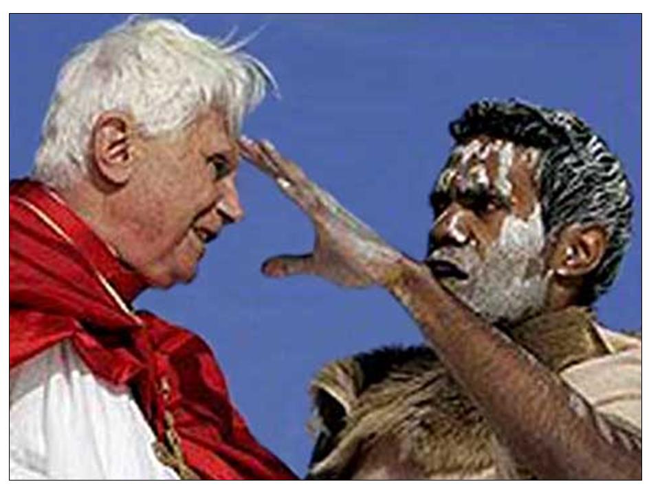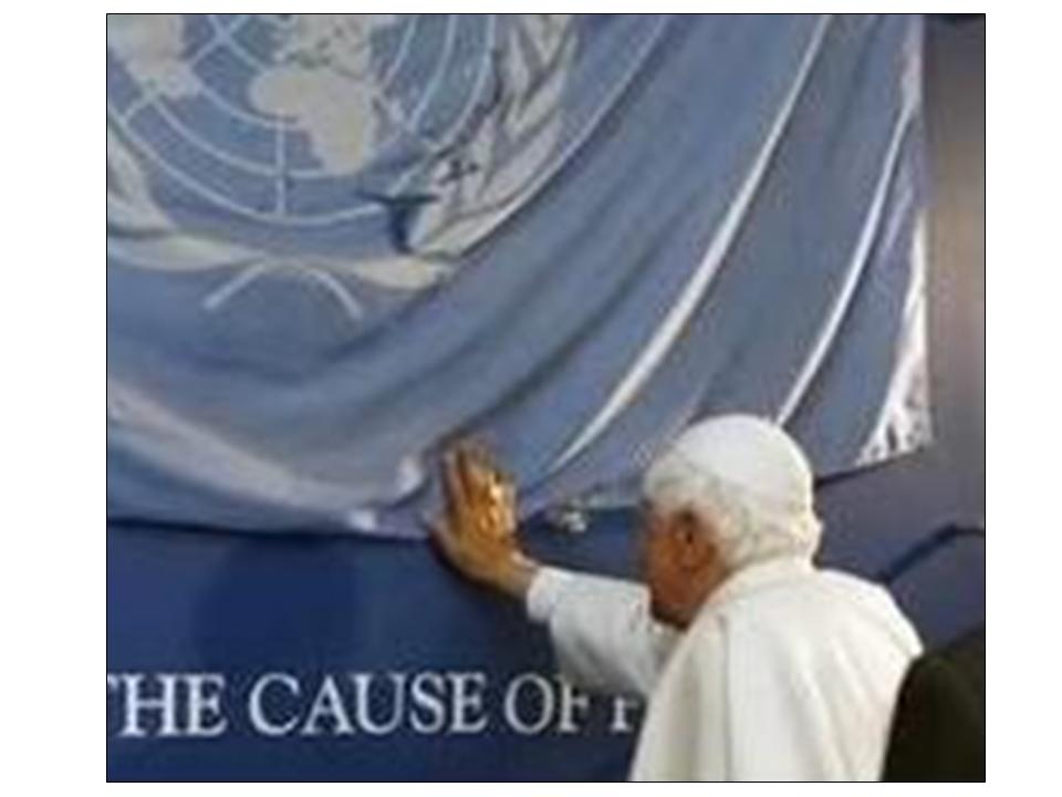 L-to-R:   (1) Ratzinger participating in a pagan ritual thereby working for the damnation of pictured pagan,  (2) Ratzinger wearing a jew hat thereby working for the damnation of the pagans who call themselves jews,  (3) Ratzinger venerating the flag of the anti-Christ "united nations" -- thereby working for the damnation of the un-baptized aborted and the un-baptized who die of starvation due to contraceptives preventing them from attaching to the wall of the womb (the "u.n." is 100% for abortion and contraception),  (4) Ratzinger being Ratzinger. Needless to say, this anathematized soul damning liar has been automatically excommunicated for decades.