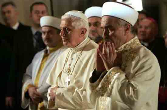 L-to-R:   (1) Ratzinger at the jew wall in Jerusalem working for the eternal damnation of the un-baptized pagans who call themselves jews,  (2) Ratzinger again working for the damnation of the jews who are all in the state of Original Sin in their un-baptized state,  (3) Now Ratzinger is working for the damnation of (other) heretics making believe they are not all automatically excommunicated for heresy and headed for Hell,  (4) Ratzinger, busy again, working for the eternal damnation of the un-baptized pagans who call themselves muslims, making believe he is praying with them (to the same God) when they all should be praying to the Catholic God.