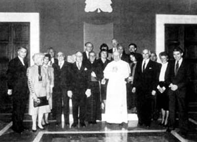 In January 2005, in his library at the Vatican, Karol Wojtyla (a.k.a. "john paul 2") receives a reward from "rabbis" (un-baptized pagans) for his constant support for the "jewish religion" (a talmudic fable which started in 200 B.C.). (photo: National "Catholic" Reporter, January 30, 2005)