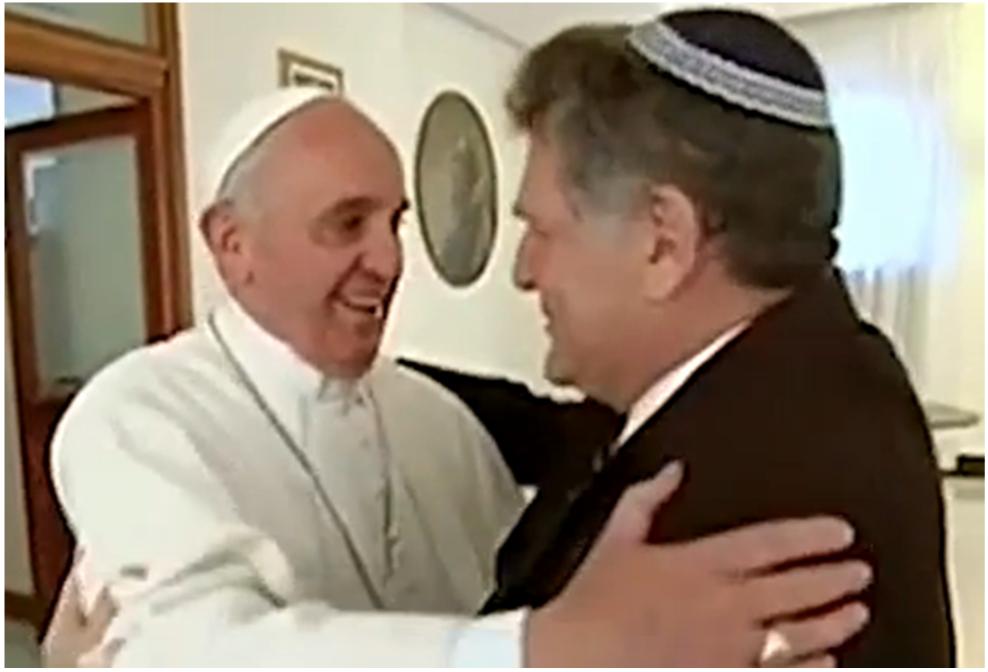 What is Bergoglio doing here ? Very simple ... he is frantically working for the eternal damnation of the un-baptized pagans who call themselves jews ... confirming them in their error and thereby shoving them toward Hell.